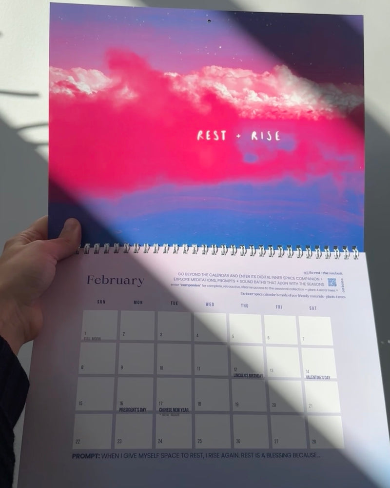 Twelve months of moving with the seasons - each month offering a theme, a reflective prompt, and a companion Inner Space journey. Created for inner celebration and quiet exploration, in service of slow living. Every calendar plants 4 trees.